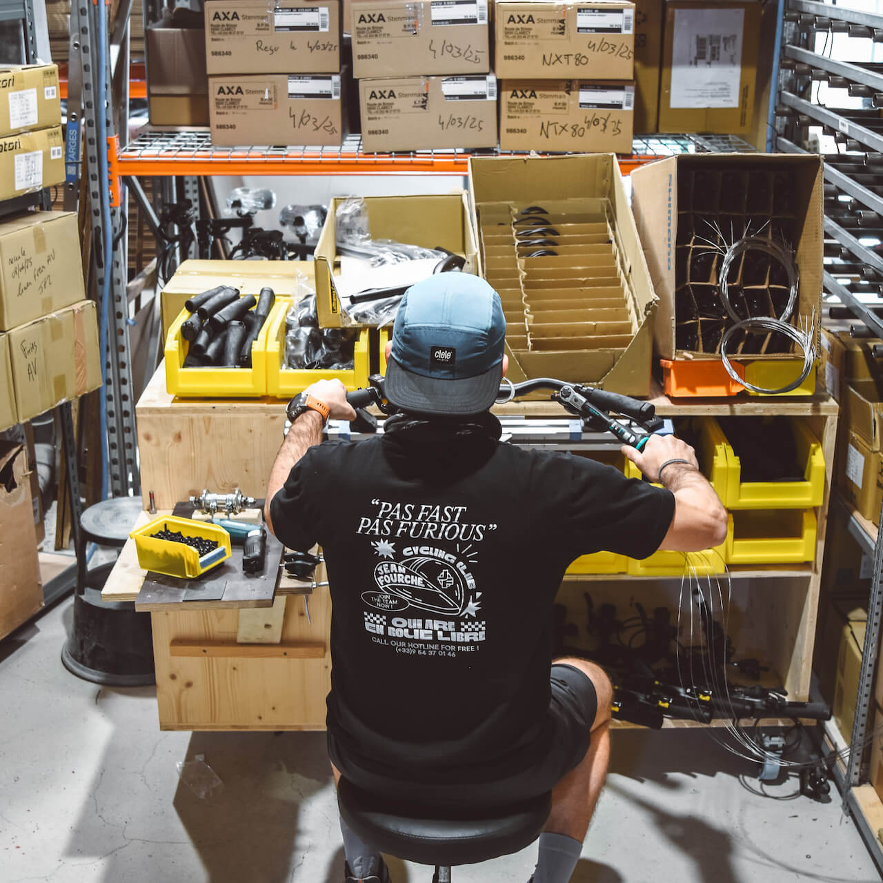 La préparation consiste à créer des sous-ensembles de pièces, c’est à dire à assembler à l’avance une partie des vélos : les postes de pilotages (cintre, potence, levier de freins…), la préparation des fourches, les kits cadre (cadre, fourche, poste de pilotage…), les roues (roue, fond de jante, pneus), le stickage des cadres…