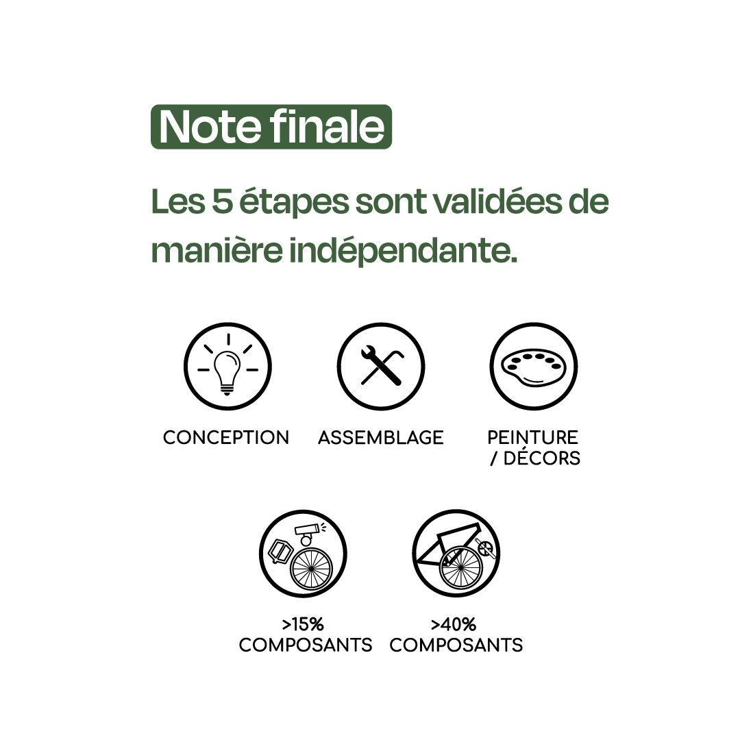 Chaque étape est validée de manière indépendante, sachant que la conception et l’assemblage doivent être minima fait en France pour prétendre à l’indice France Vélo.