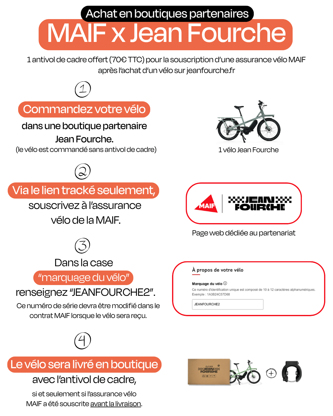 Cet antivol de cadre sera expédié avec la commande de votre vélo si et seulement si vous achetez un vélo (sur jeanfourche.fr ou en boutique partenaires) ET que vous souscrivez une assurance MAIF sur ce lien tracké par la suite.