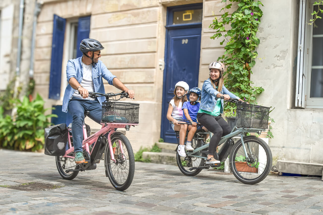 1 famille sur 2 vélos cargo compact, photo floue prise de côté