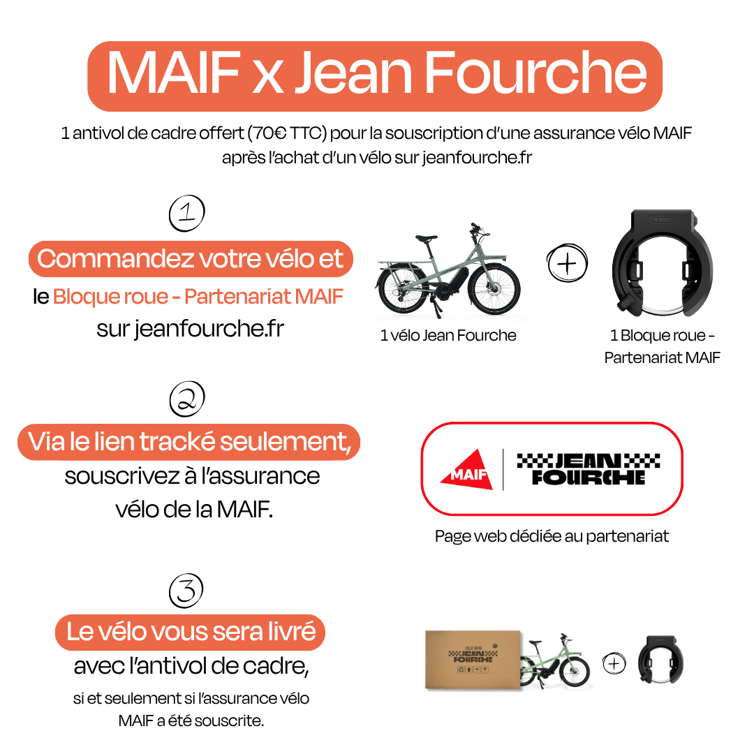 Que vous soyez déjà sociétaire ou non, profitez d’un antivol de cadre offert pour la souscription d’une assurance vélo MAIF après avoir acheté un vélo Jean Fourche (achat sur jeanfourche.fr uniquement).